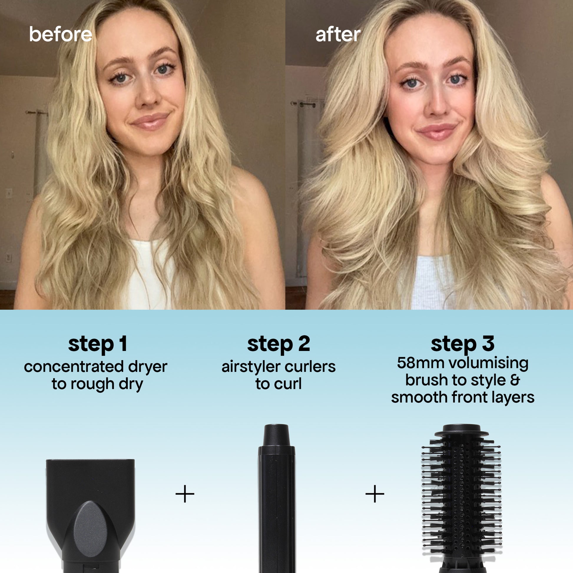 For voluminous blowouts, use the 58mm round brush to glide through sections, flipping outward at the ends. The 32mm round brush is ideal for shorter hair or adding lift to bangs.