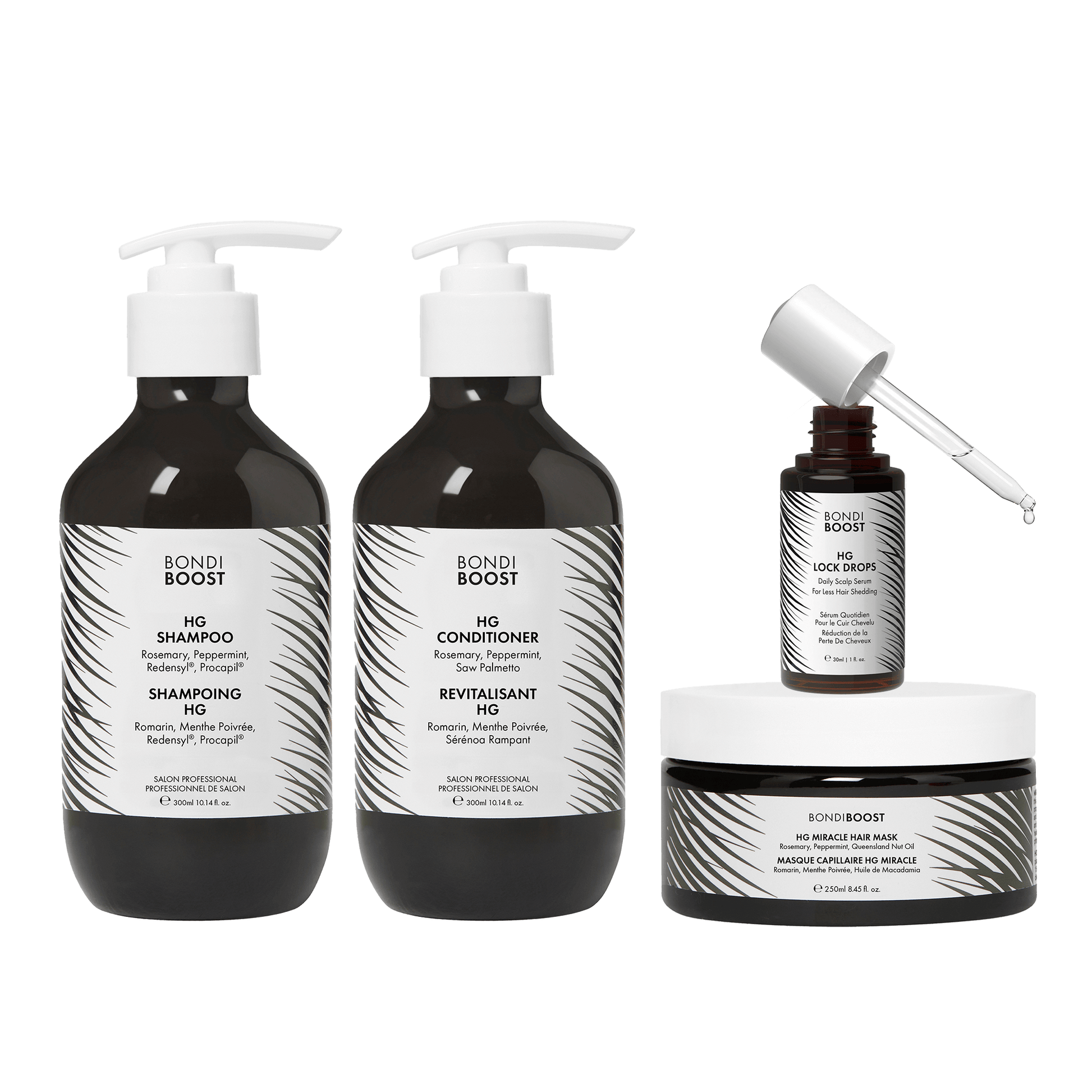 Four targeted steps. One focused routine designed to support hair health throughout your GLP-1 journey. The HG Shampoo gently cleanses to refresh the scalp, the HG Conditioner helps strengthen and soften strands, the Miracle Hair Mask delivers deep nourishment and repair, and the Lock Drops provide daily scalp support to help anchor hair at the root.