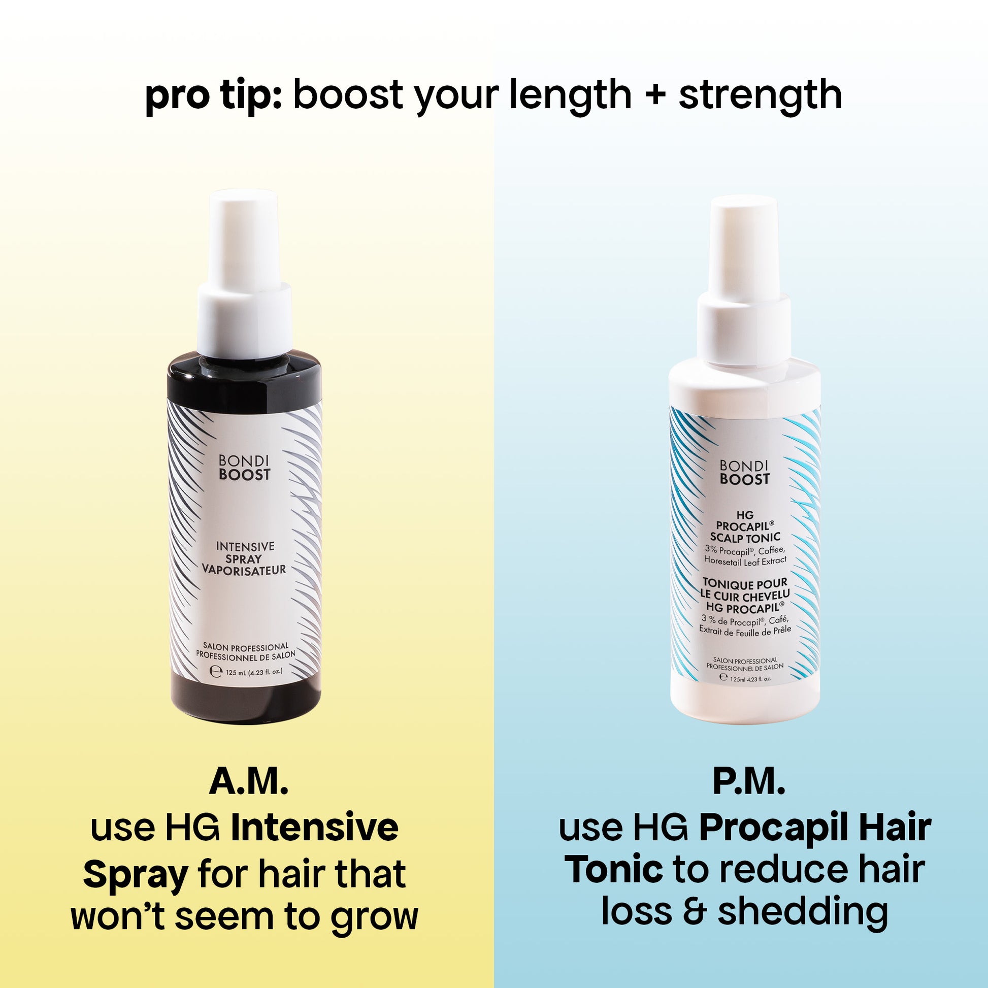 We recommend you use Intensive Spray in the AM to support hair that won't seem to grow, and Procapil Tonic in the PM, to reduce hair loss and shedding.