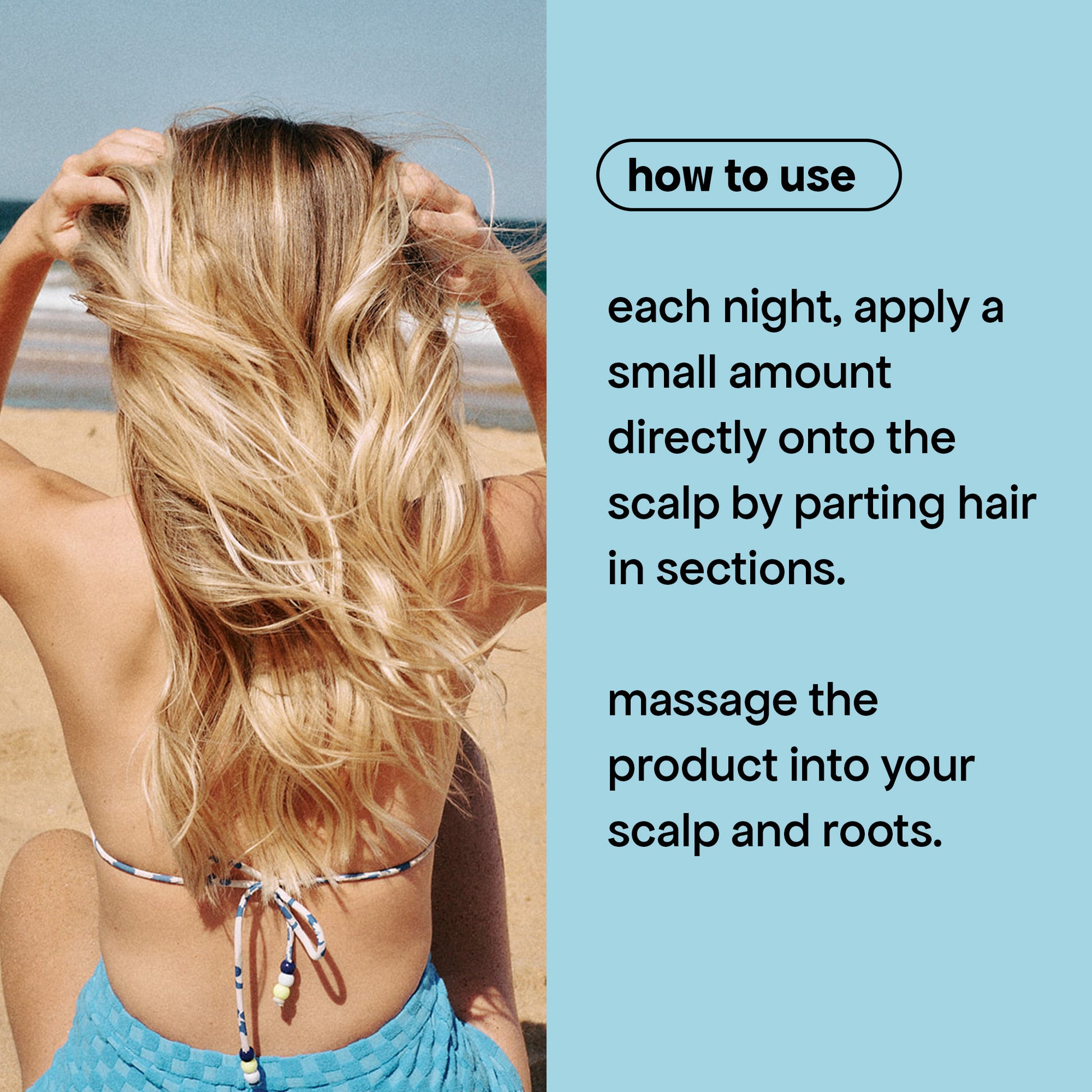 Use on wet or dry hair, no need to rinse. Each night, spritz a small amount directly onto the scalp in sections by parting hair, and massage product into your scalp and roots. Use daily.