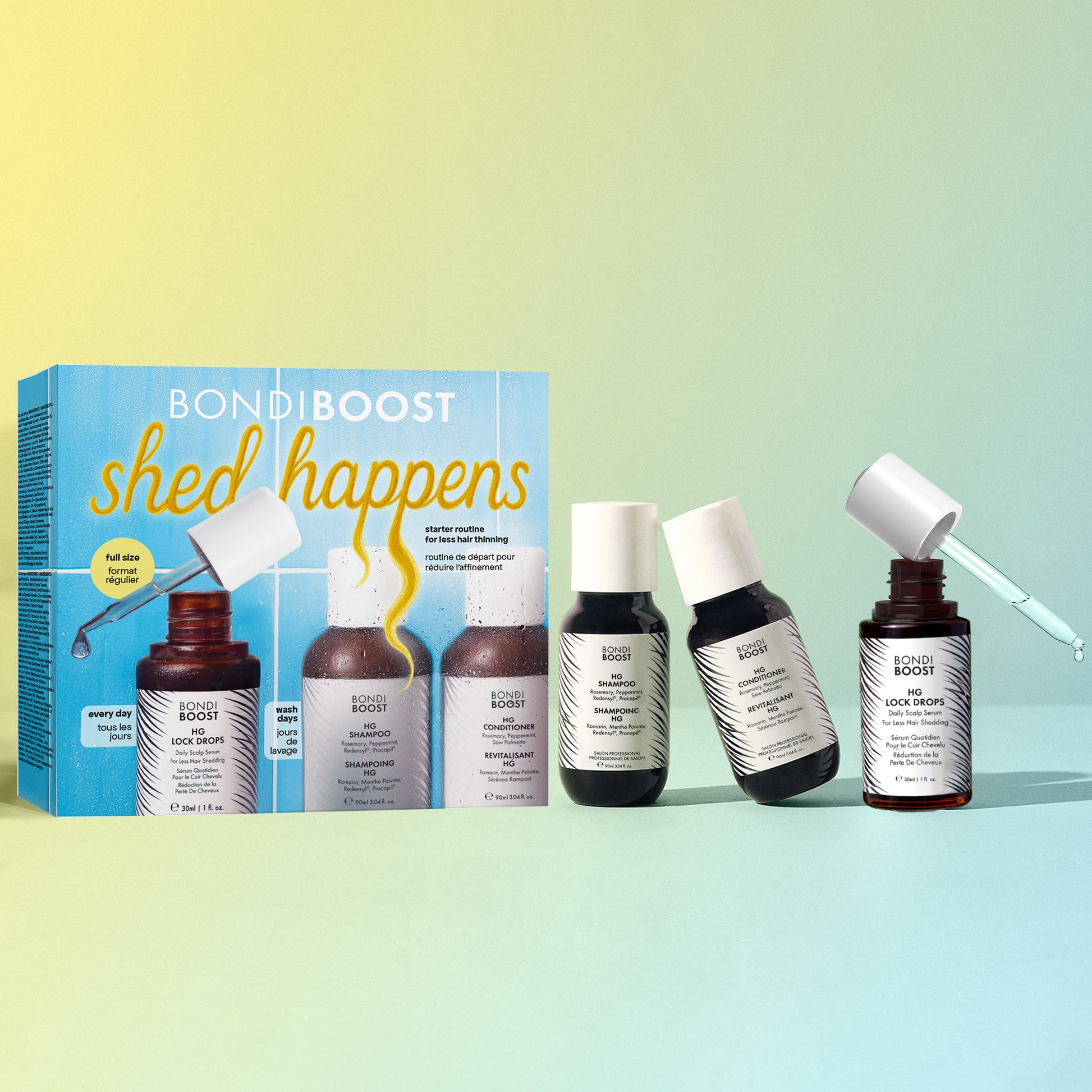 The HG Shampoo and Conditioner gently cleanse, hydrate, and fortify, while Lock Drops—our most powerful anti-shedding serum—deliver targeted scalp care to help anchor hair at the root and combat thinning. Now in perfectly portable minis, this trio is the perfect starter kit or travel-friendly version of your HG essentials.