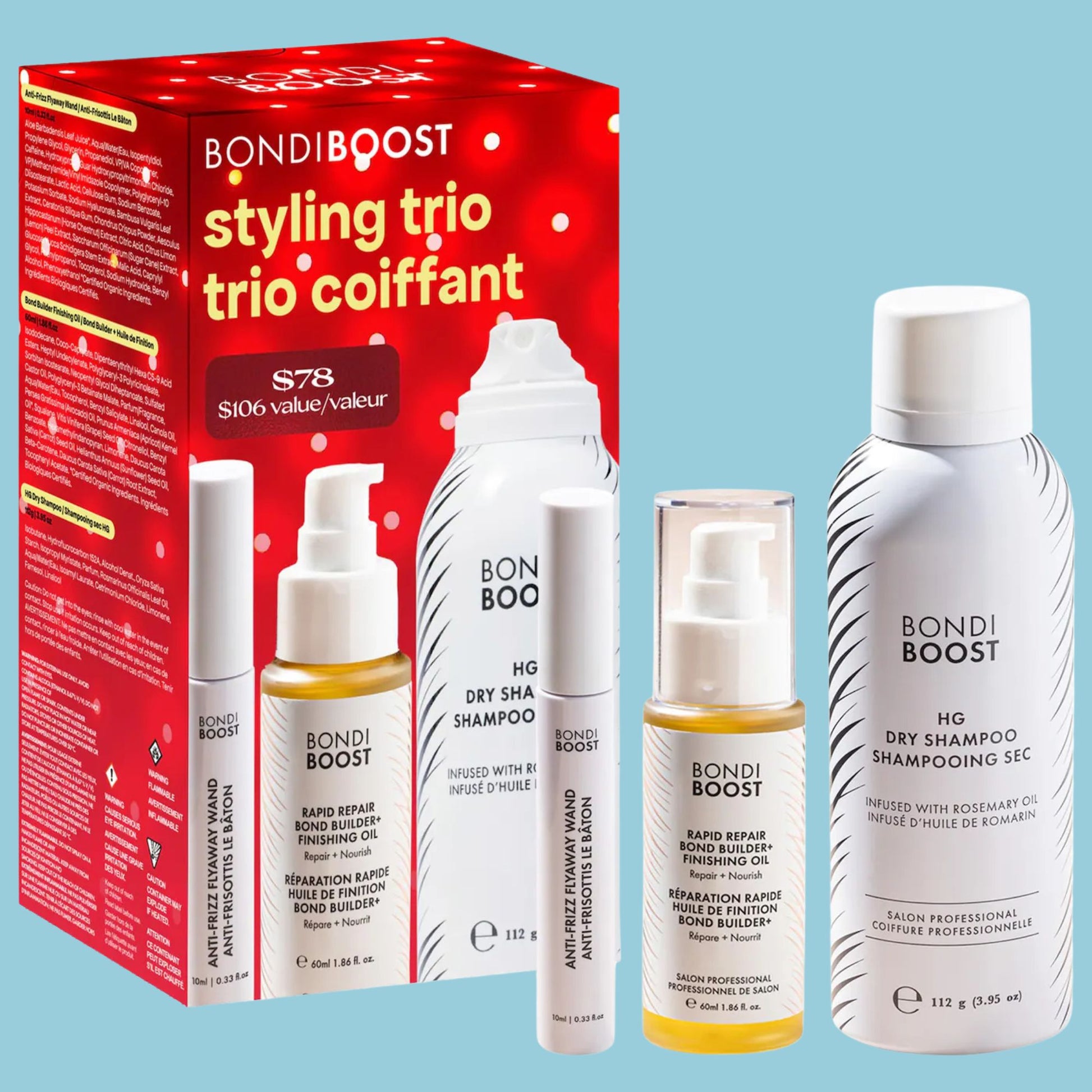 This limited-edition three-step styling set delivers clean, smooth, and voluminous hair in minutes. The dry shampoo absorbs oil and adds instant lift at the roots for refreshed, full-bodied strands. The Rapid Repair Bond Builder+ Oil protects against heat up to 450°F, seals split ends, and adds shine without weighing hair down. Finish with the Flyaway Wand—infused with castor oil—to tame frizz, slick down baby hairs, and lock in polished styles on the go.